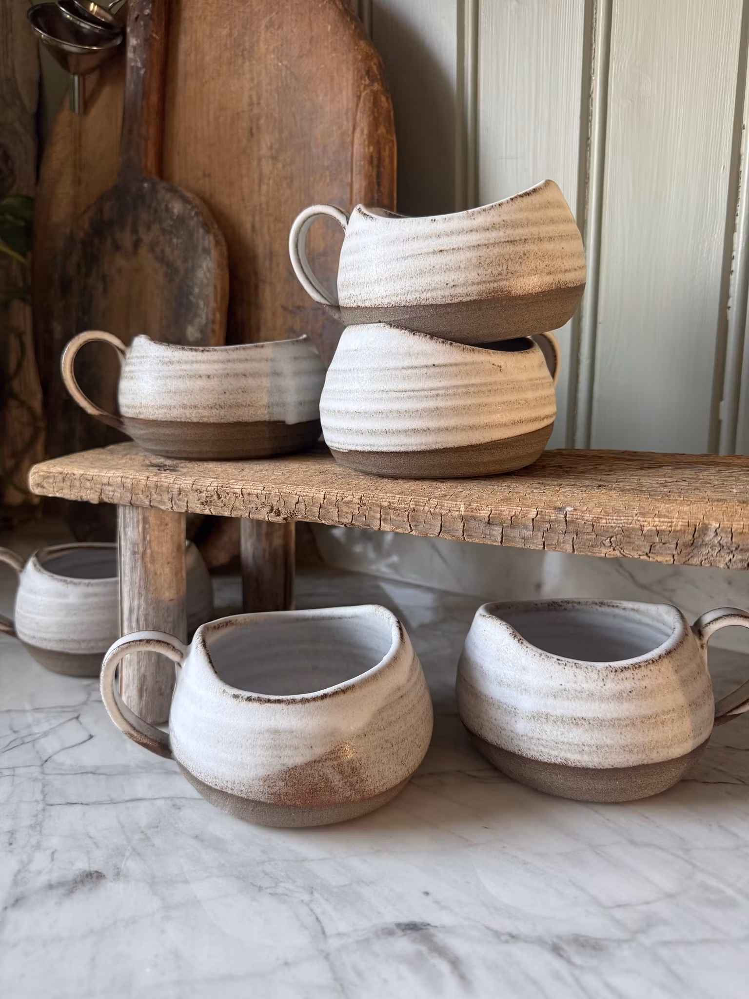 En drejad mugg i grå stengodslera som fått en rustik vit matt glasyr. Rimmen på muggen har skurits med kniv för att skapa ett vackert assymetriskt avslut. Drick en varm choklad med marshmallows ur dessa eller servera en smarrig förrätt eller efterrätt som äts med sked. Kan användas till så mycket mer än bara kaffe och te som kanske är det första man tänker på.