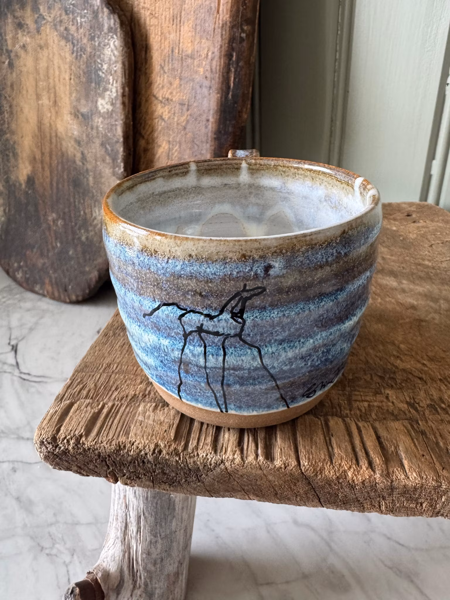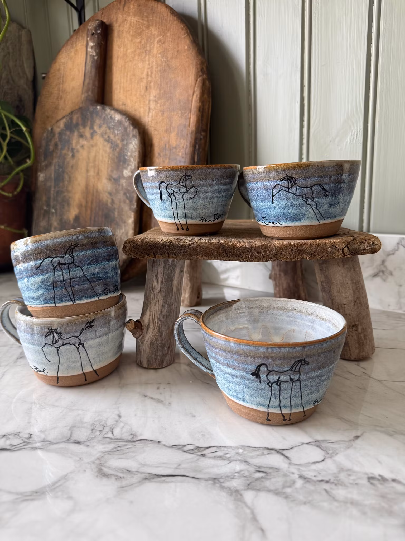 En unik mugg med en handmålad häst av konstnären HippoStina. Hästen är målad efterhand på färdigbränd keramik med en keramikpenna som härdats och sitter fast även i diskmaskin men för livslängdens skull rekommenderas handdisk på all keramik med målade hästar.