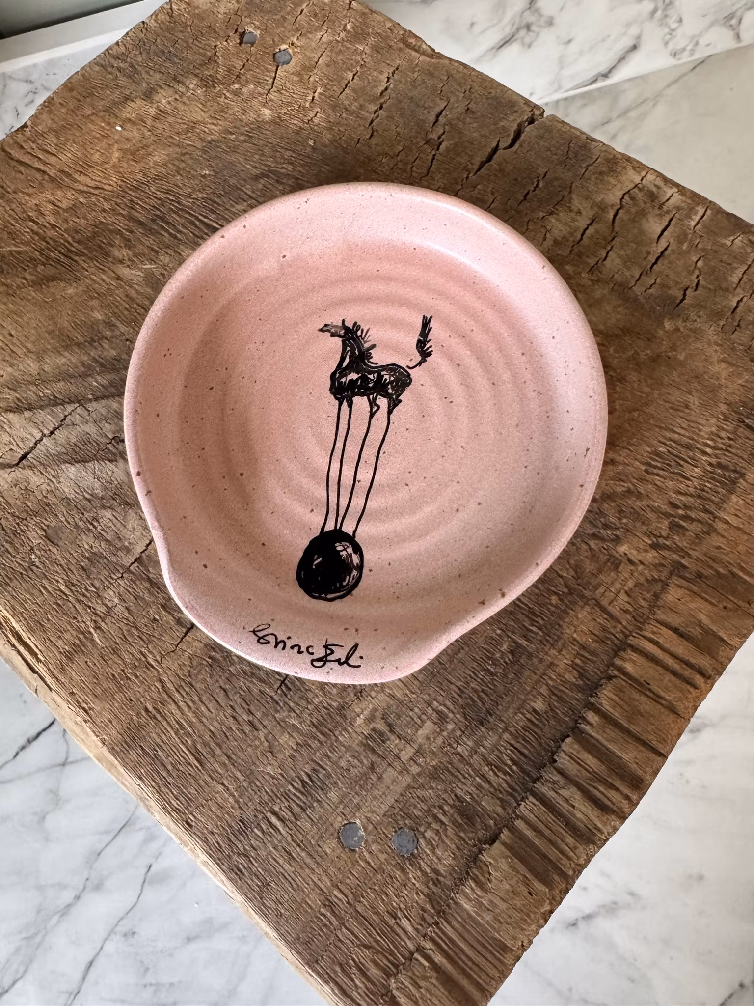 Ett unikt exemplar av ett rosa slevfat med en handmålad häst av konstnären HippoStina. Mått ca 10 cm. Hästen är målad efterhand på färdigbränd keramik med en keramikpenna som härdats och sitter fast även i diskmaskin men för livslängdens skull rekommenderas handdisk på all keramik med målade hästar. Slevfatet är drejat i stengodslera.
