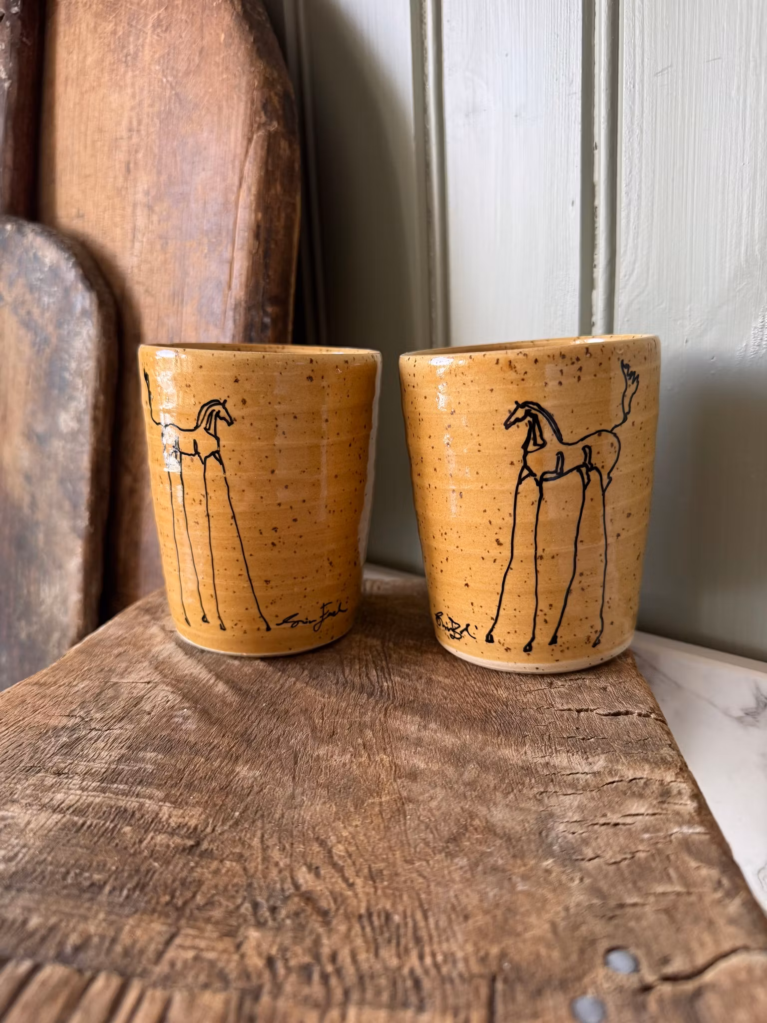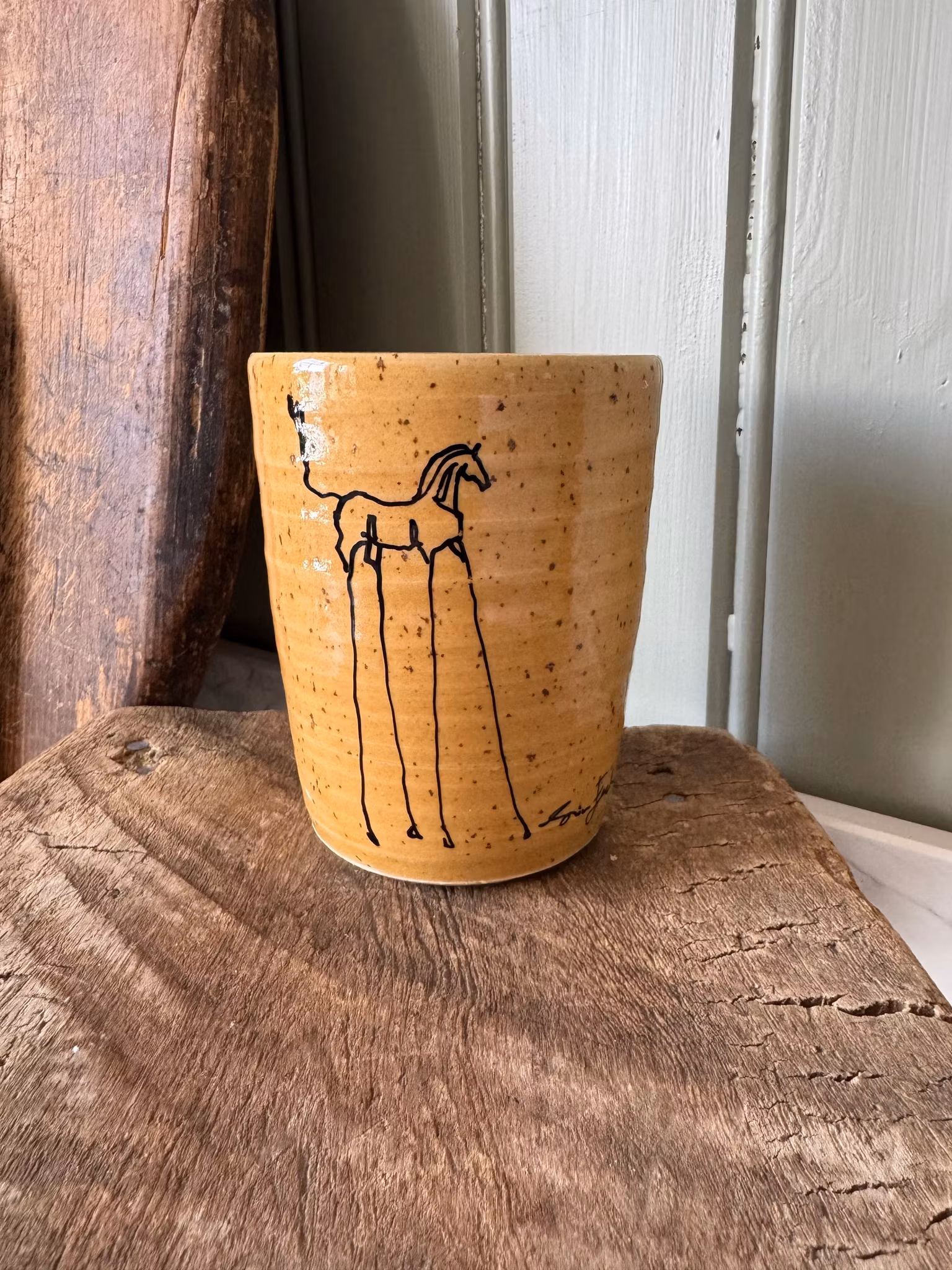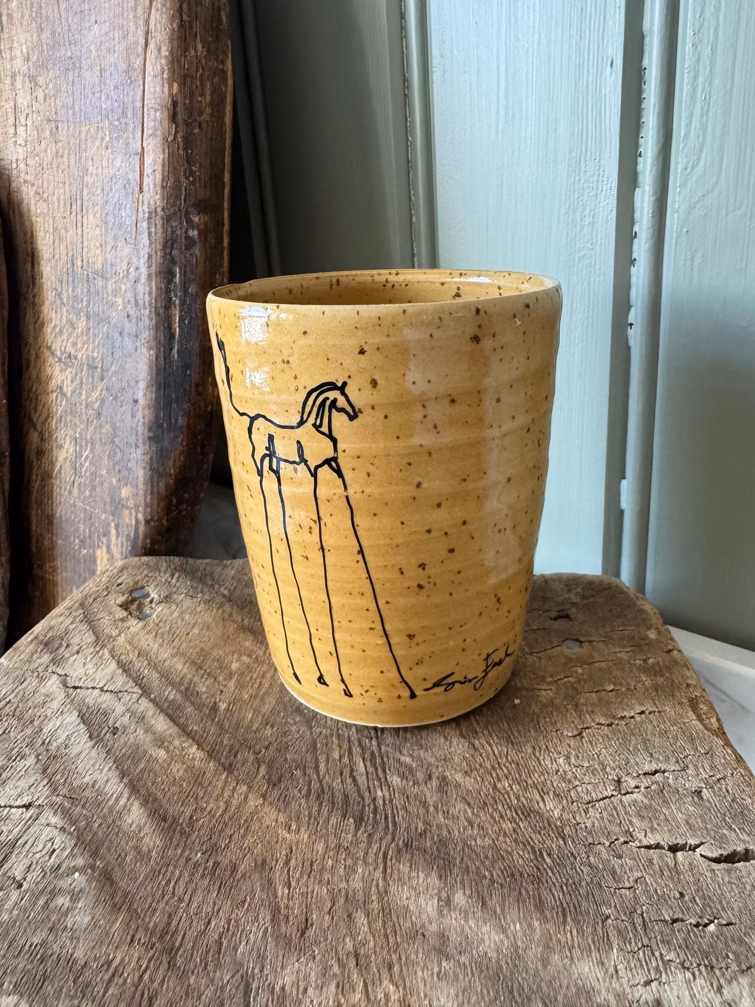 En unik mugg med en handmålad häst av konstnären HippoStina. Hästen är målad efterhand på färdigbränd keramik med en keramikpenna som härdats och sitter fast även i diskmaskin men för livslängdens skull rekommenderas handdisk på all keramik med målade hästar.
