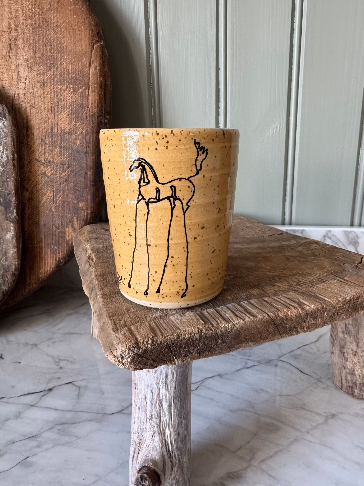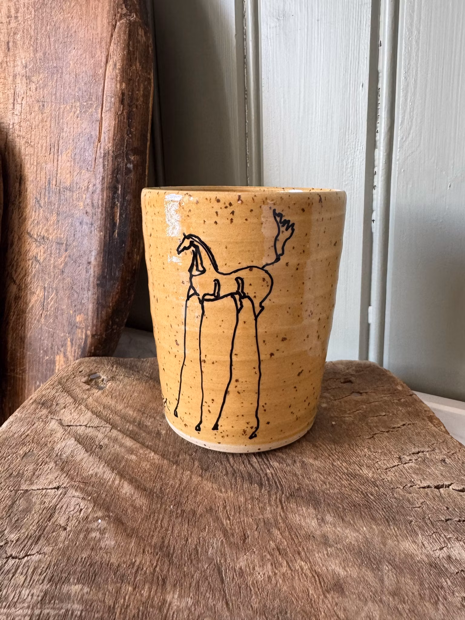 En unik mugg med en handmålad häst av konstnären HippoStina. Hästen är målad efterhand på färdigbränd keramik med en keramikpenna som härdats och sitter fast även i diskmaskin men för livslängdens skull rekommenderas handdisk på all keramik med målade hästar.
