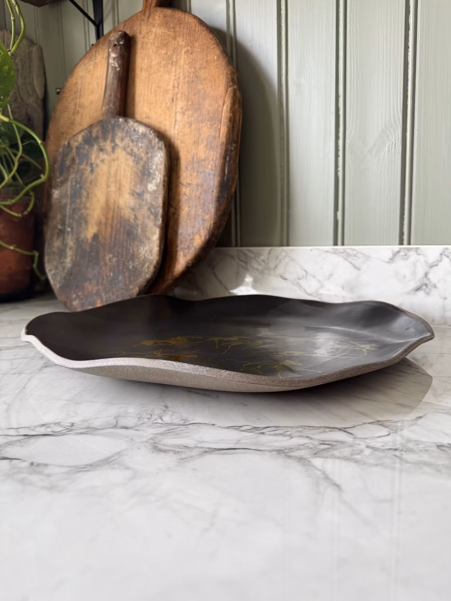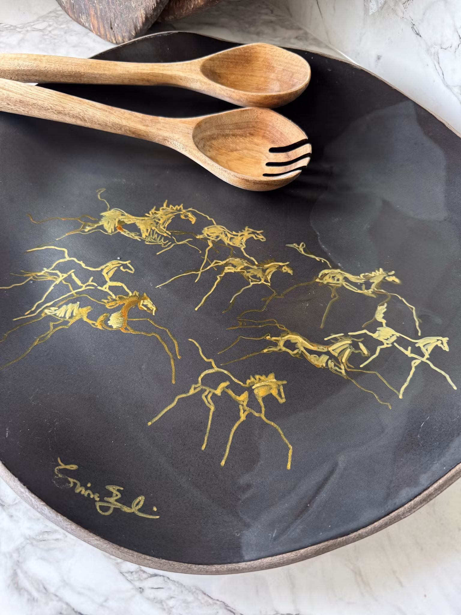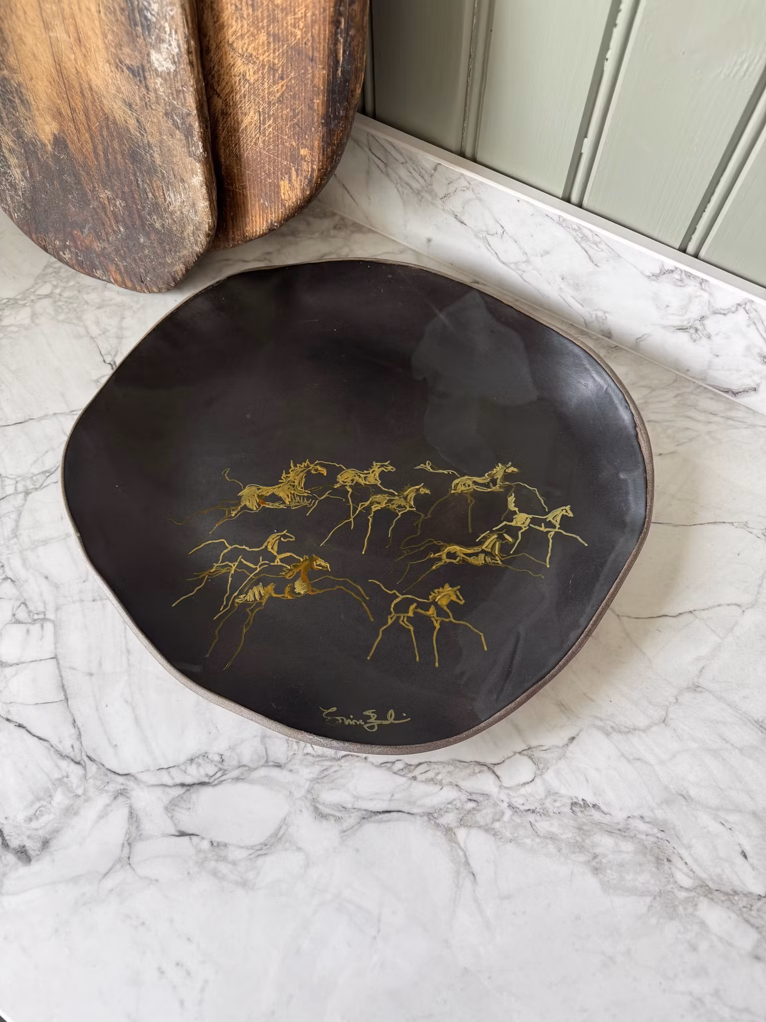 Ett unikt one of a kind stort kavlat fat med en flock guldhästar som HippoStina har målat. Fatet har en uppböjd kant på ca 3 cm och mäter ca 39x42 cm i diameter. Ett stort fat med andra ord. Kan med fördel ställas på en tavellist och pryda väggen hemma. Hästarna är målade efterhand på färdigbränd keramik med en keramikpenna som härdats och sitter fast även i diskmaskin men för livslängdens skull rekommenderas handdisk på all keramik med målade hästar. Fatet är gjord i grå stengodslera.