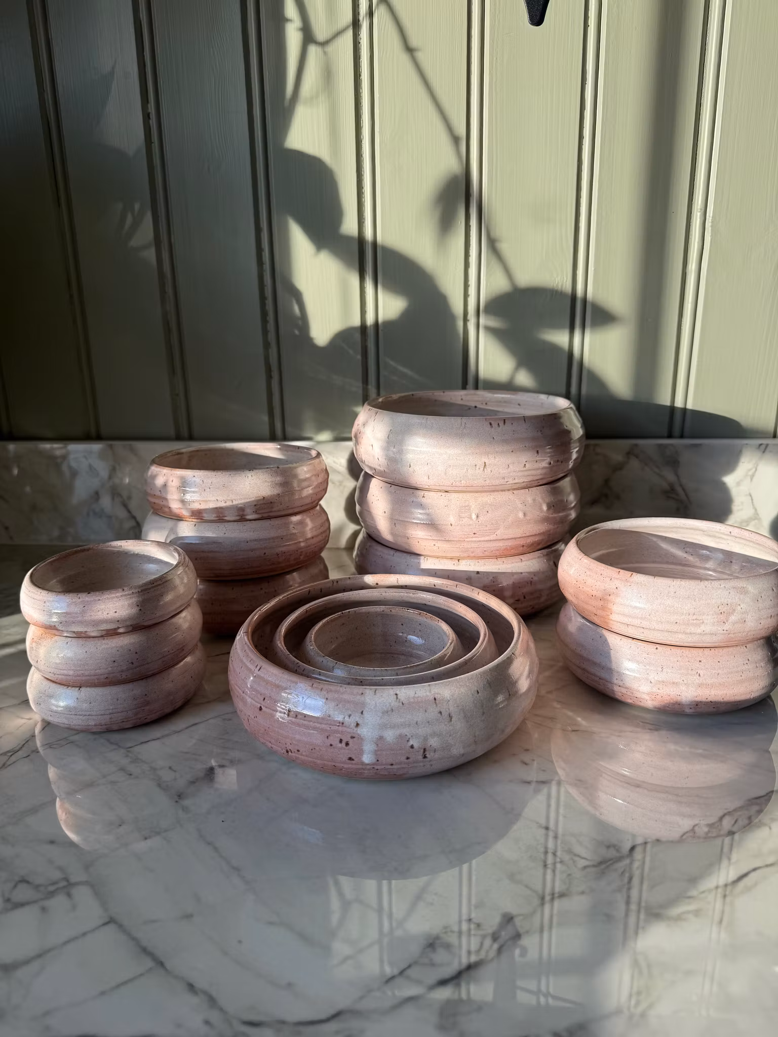 Mått ca 3 cm hög och 9 cm vid. Drejad i vit lavalera i stengods med en tjusig rosa glasyr. Variationer förekommer då dom glaseras och får olika mönster av glasyren. Tål diskmaskin och mikro.