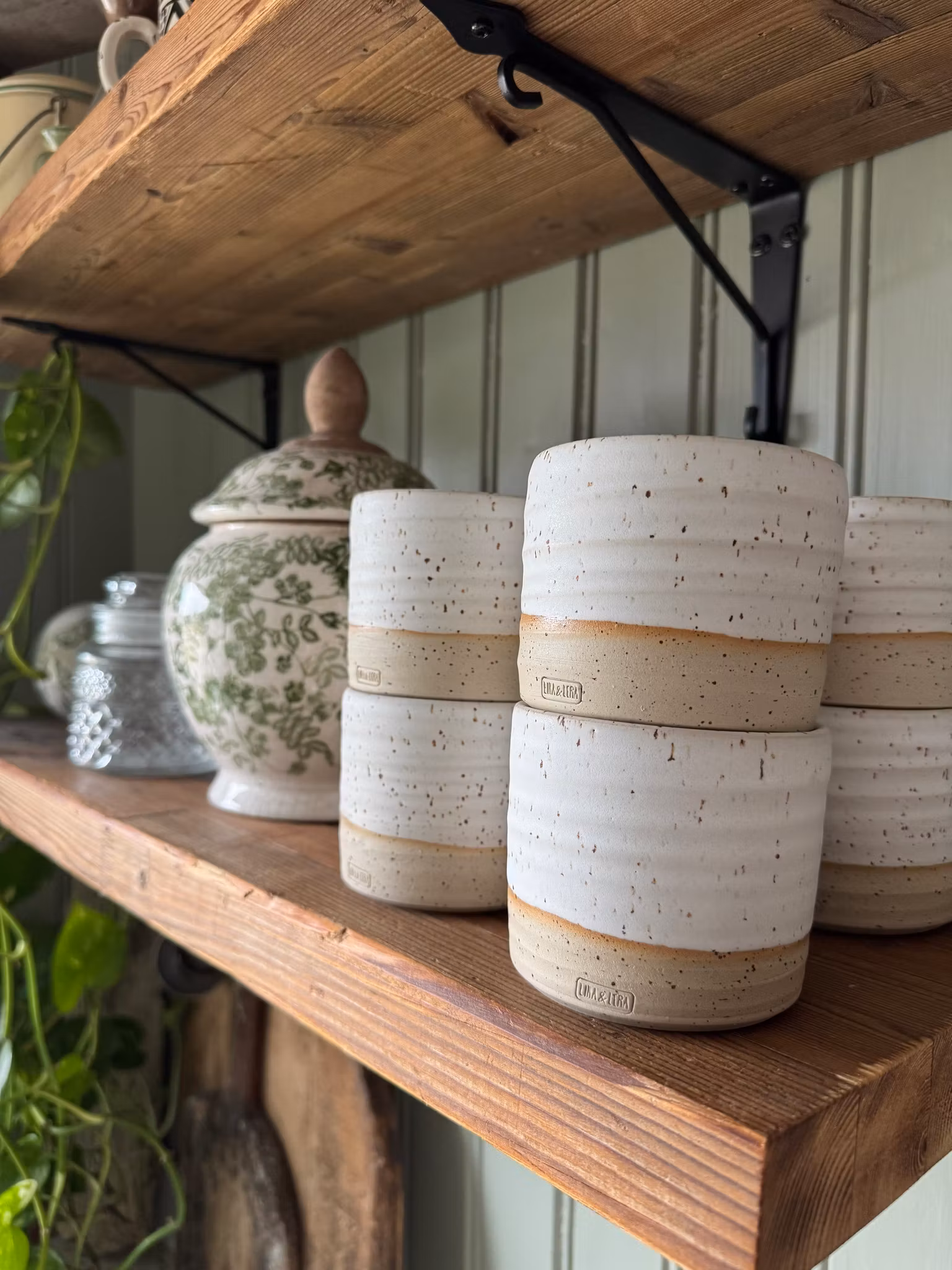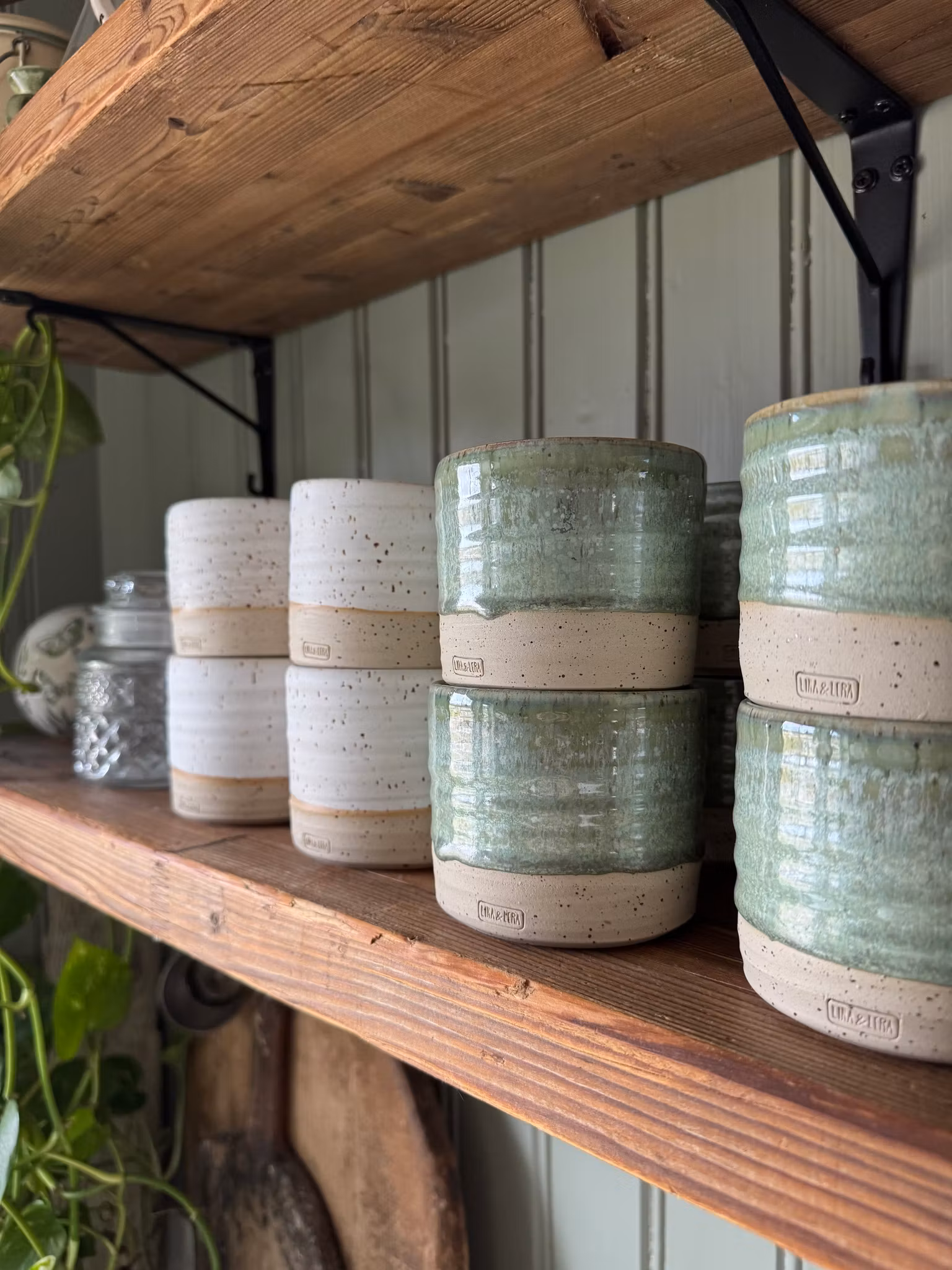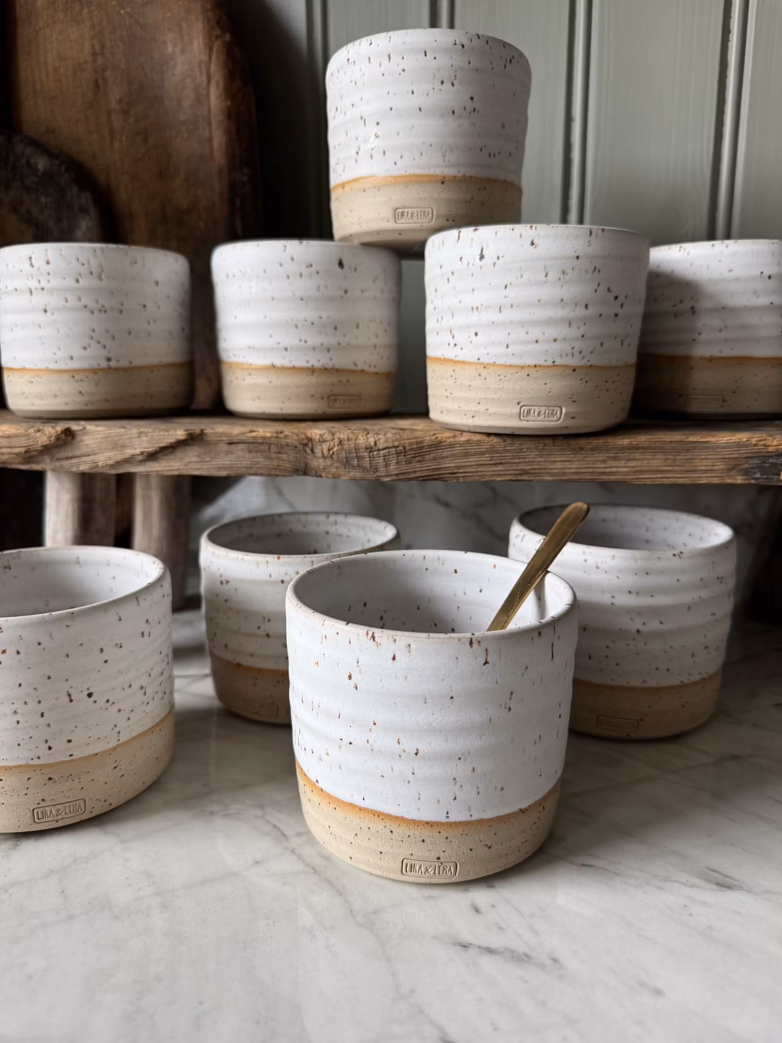 En robust mugg i rak modell drejad i stengodslera med en vit matt glasyr. Används med fördel till såväl varm som kall dryck. Höjd ca 8.5 cm och 9 cm vid. Muggen rymmer ca 3.5 dl. Tål diskmaskin och mikro.