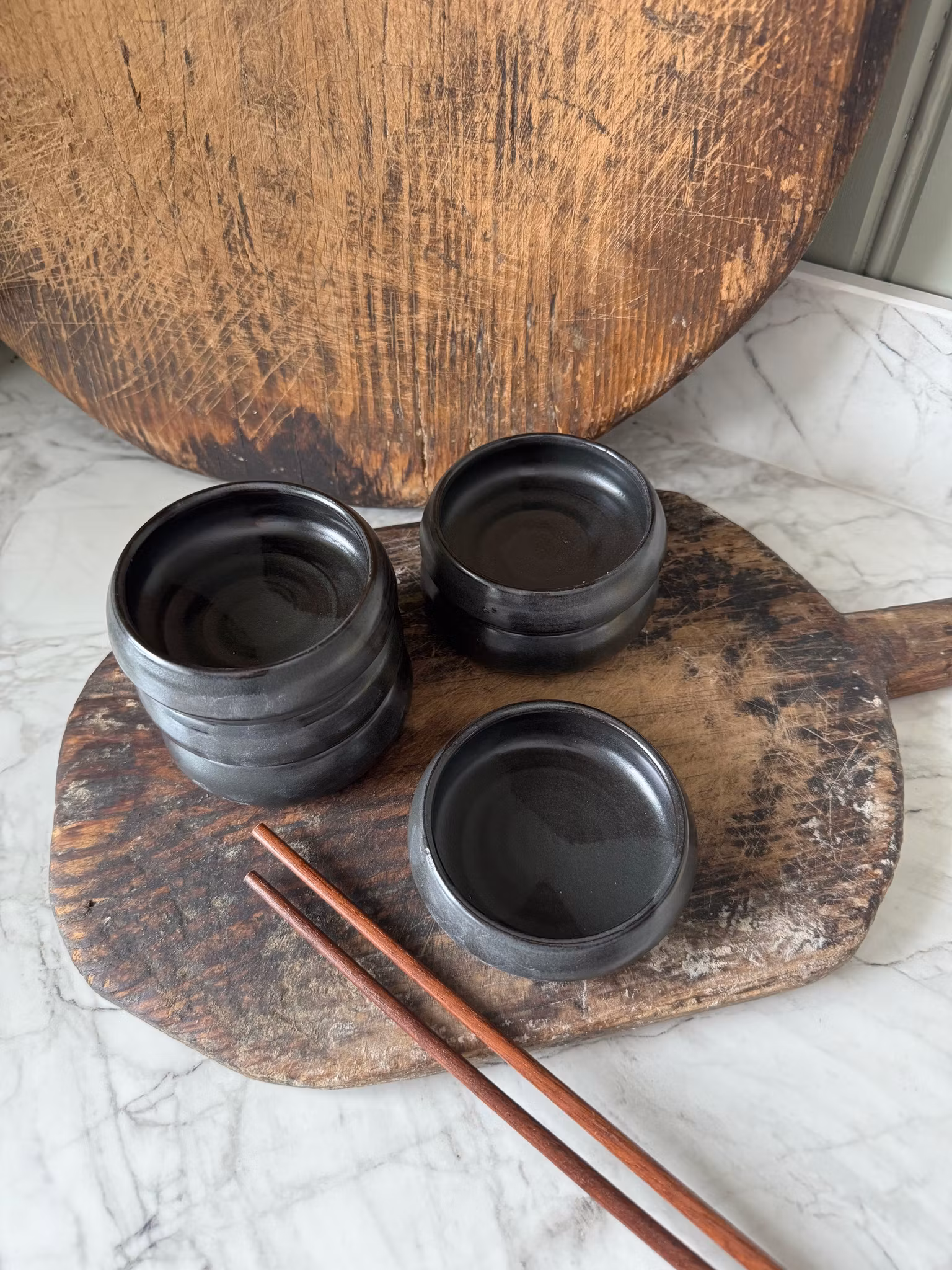 Mått ca 3 cm hög och 9 cm vid. Drejad i stengodslera med svart matt glasyr. Variationer förekommer då dom glaseras och får olika mönster av glasyren samt det bruna som slår igenom skiftar. Tål diskmaskin och mikro.