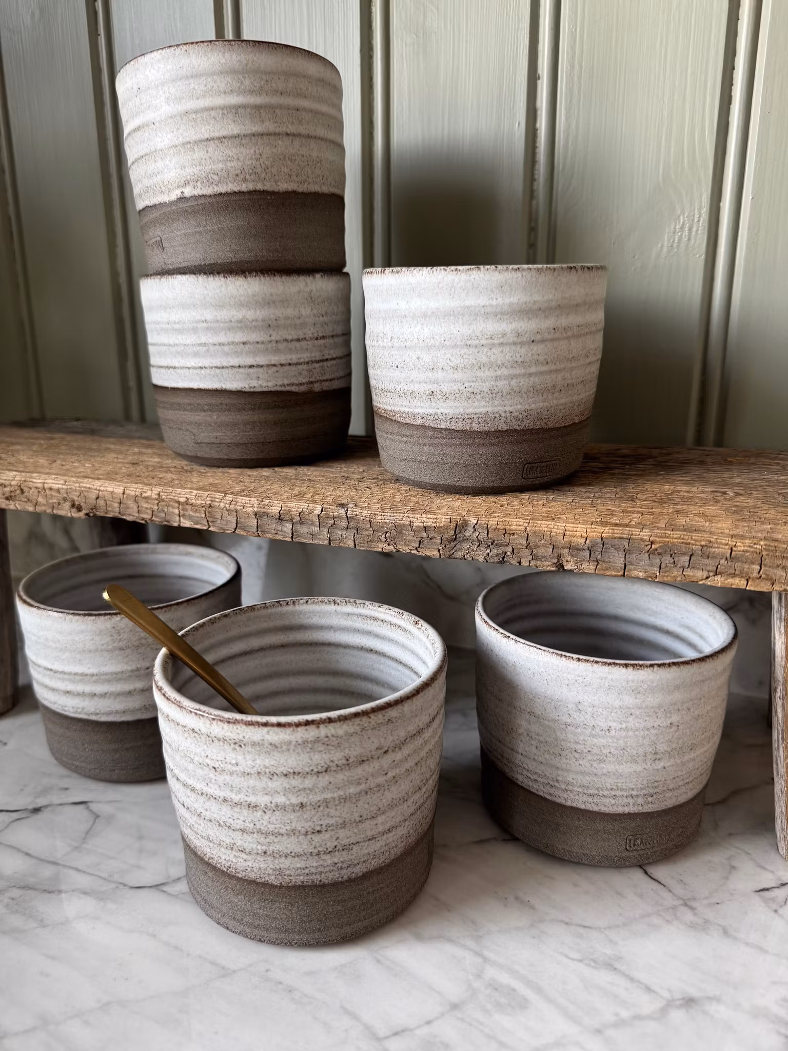 En robust mugg i rak modell drejad i återvunnen stengodslera. Används med fördel till såväl varm som kall dryck. Höjd ca 8.5 cm och 9 cm vid. Muggen rymmer ca 3.5 dl. Tål diskmaskin och mikro.
