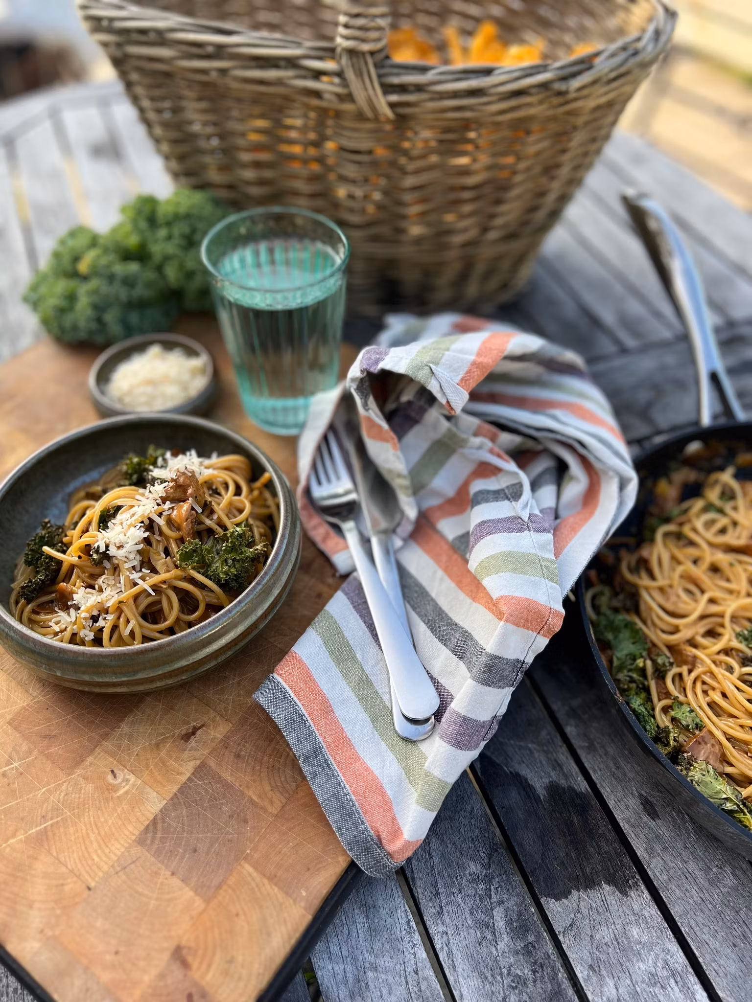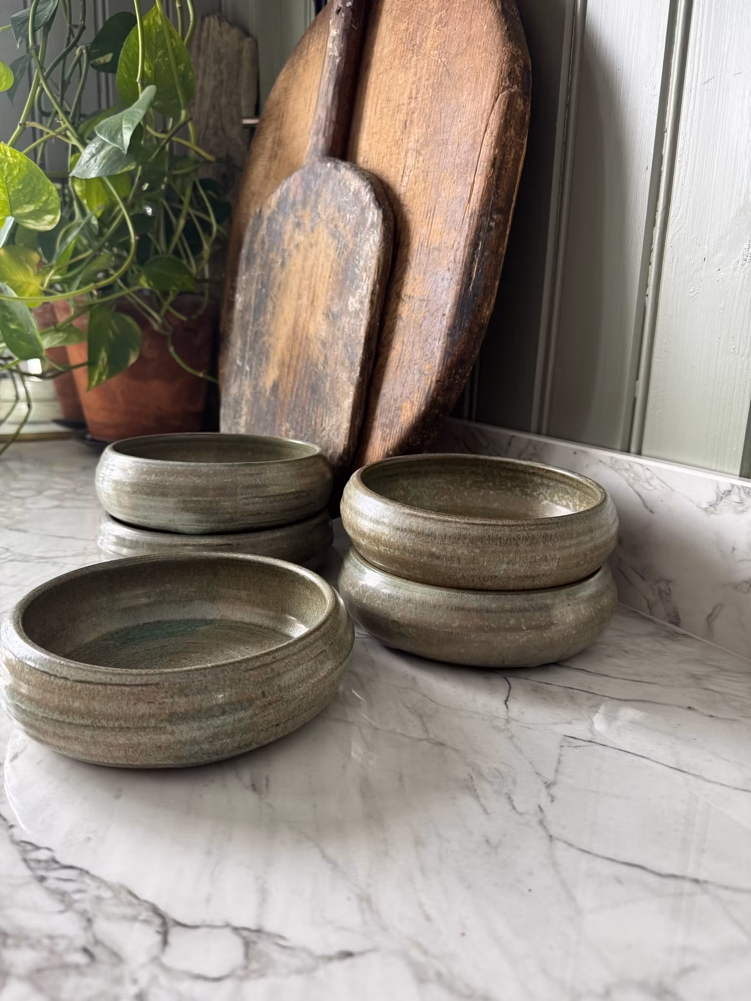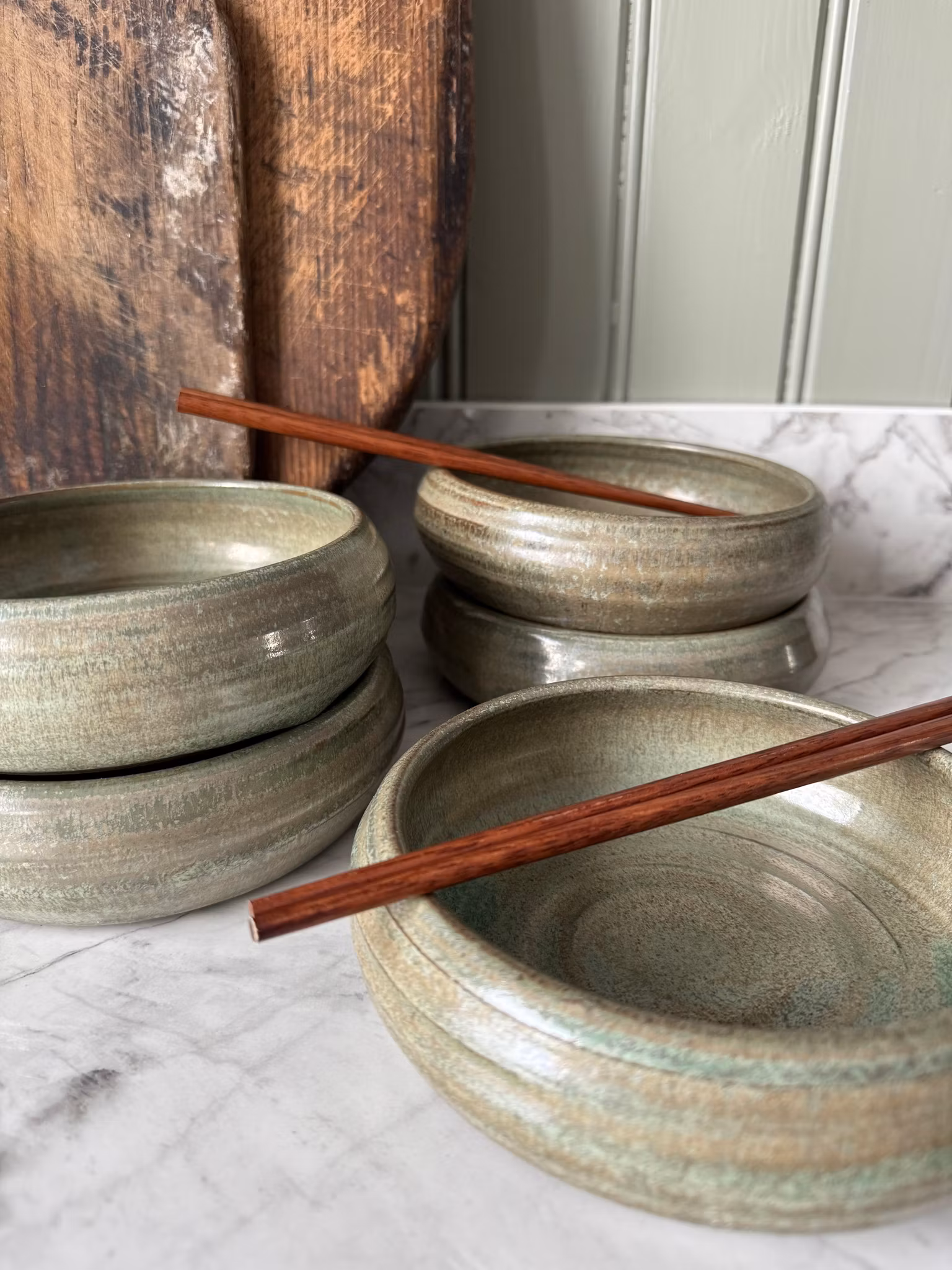 Matskål i rustik grön glasyr. En populär form som passar såväl till asiatiska bowls som soppor eller snacks. Med fördel äts rätter med sked ur dessa då den insvängda toppen gör det lätt att få med maten på skeden men givetvis fungerar rätter med bestick eller pinnar också. Drejad i svart stengodslera. Variationer förekommer då skålarna är handgjorda och glasyren kan skilja sig något från olika batcher.