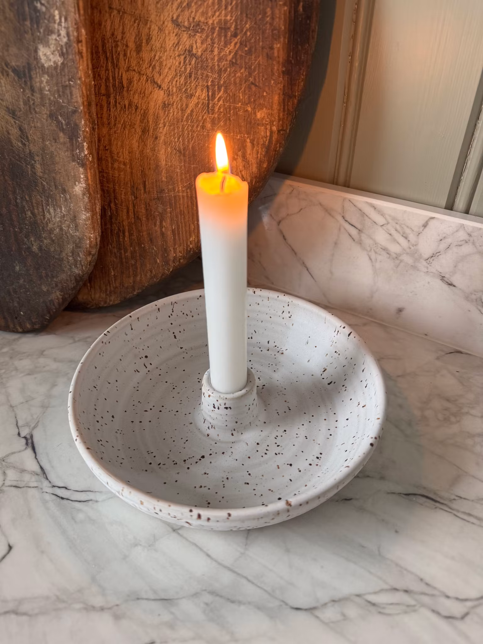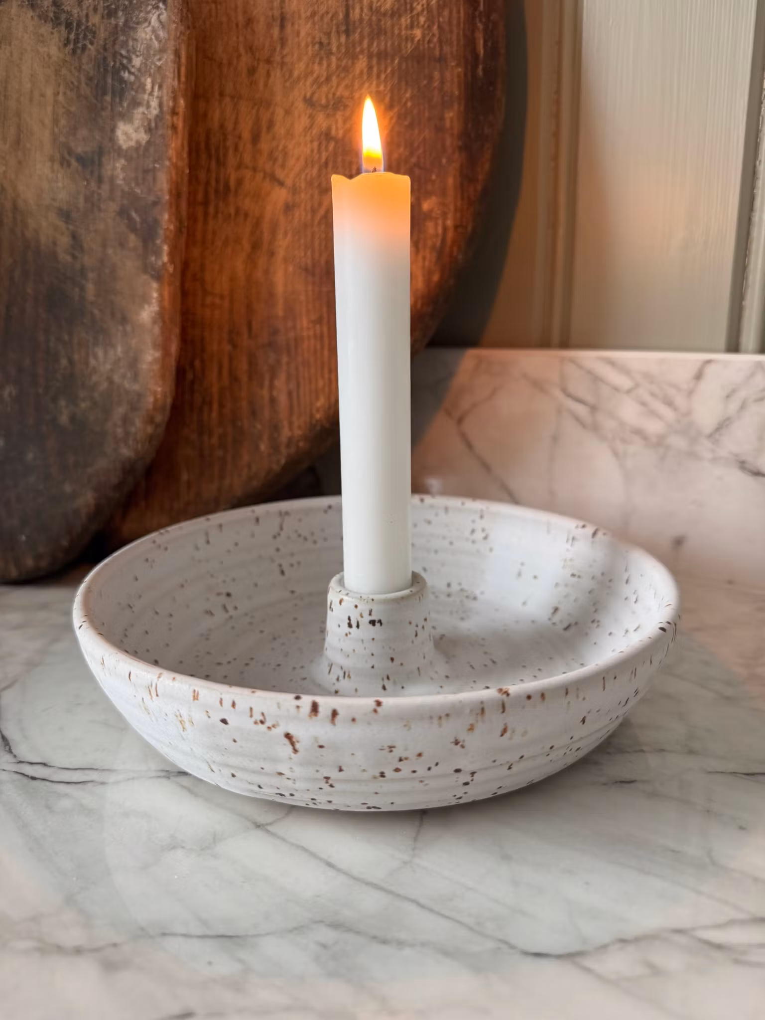 Ett ljusfat i vit matt glasyr med dom urtjusiga prickarna från lavaleran där det finns gott om utrymme att dekorera efter säsong. Fyll fatet med det du önskar eller låt det vara som det är. Drejad i vit lava stengodslera. Tål diskmaskin ifall stearinstänk uppstår.