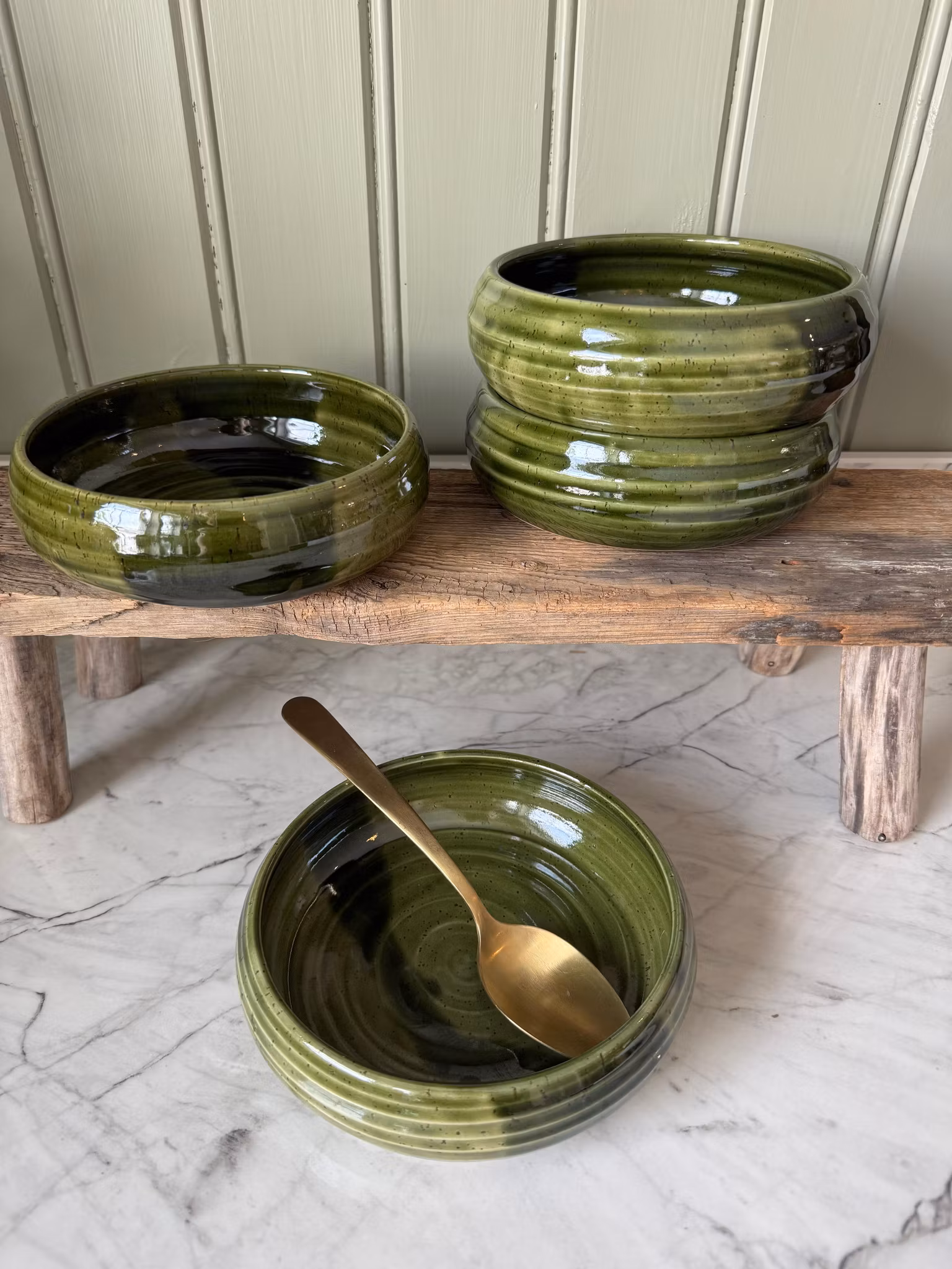 Matskål i pinjegrön glasyr. En populär form som passar såväl till asiatiska bowls som soppor eller snacks. Med fördel äts rätter med sked ur dessa då den insvängda toppen gör det lätt att få med maten på skeden. Denna glasyr gör inte bort sig tillsammans med den ockragula i sortimentet, ett tips är att blanda upp dessa två glasyrer tillsammans.