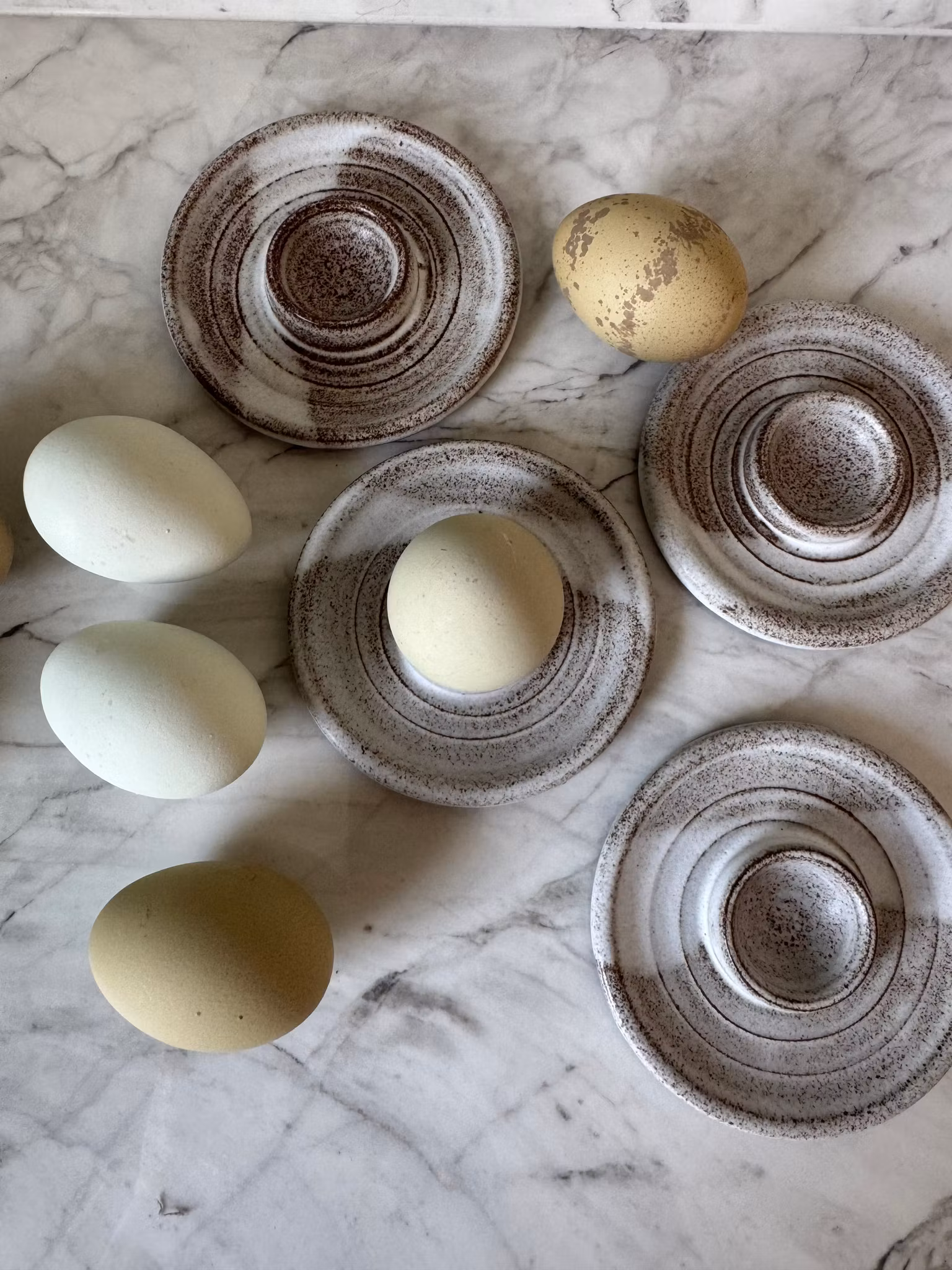 Äggkoppar i en stilren design med rustik glasyr. Det lilla fatet lämpar sig att lägga äggskalet och en klick kaviar på. Dom går utmärkt att stapla och tar inte så mycket plats då koppen för ägget är låg. Duka upp till en härlig helgfrukost med dessa godbitar.