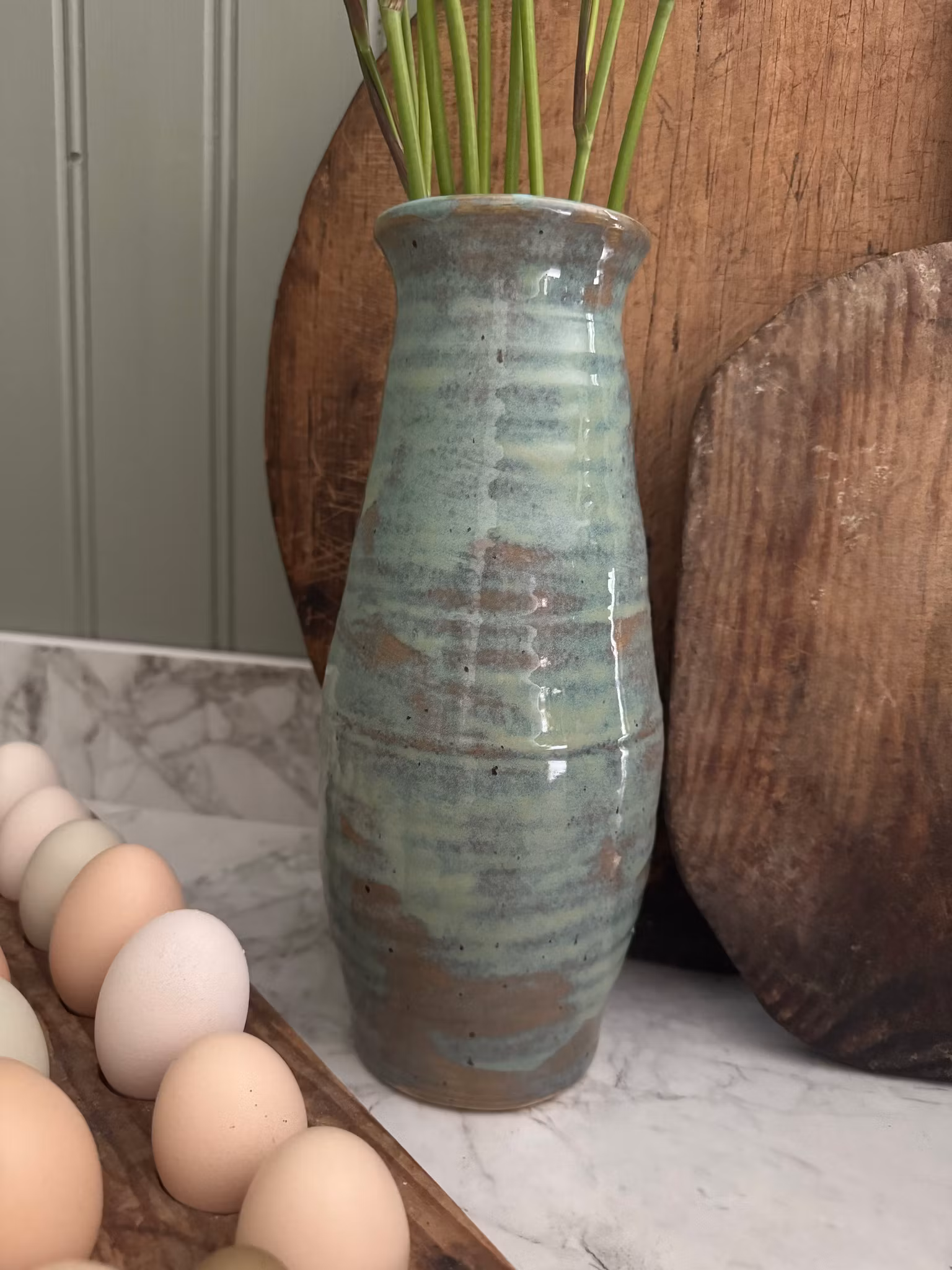 En unik hög vas drejad i vit lavalera i stengods. Den har fått en grov botten och vägg för att bli tung och stå stadigt. Glaserad i en tjusig mintgrön glasyr med inslag av turkost där glasyren ligger extra tjockt.