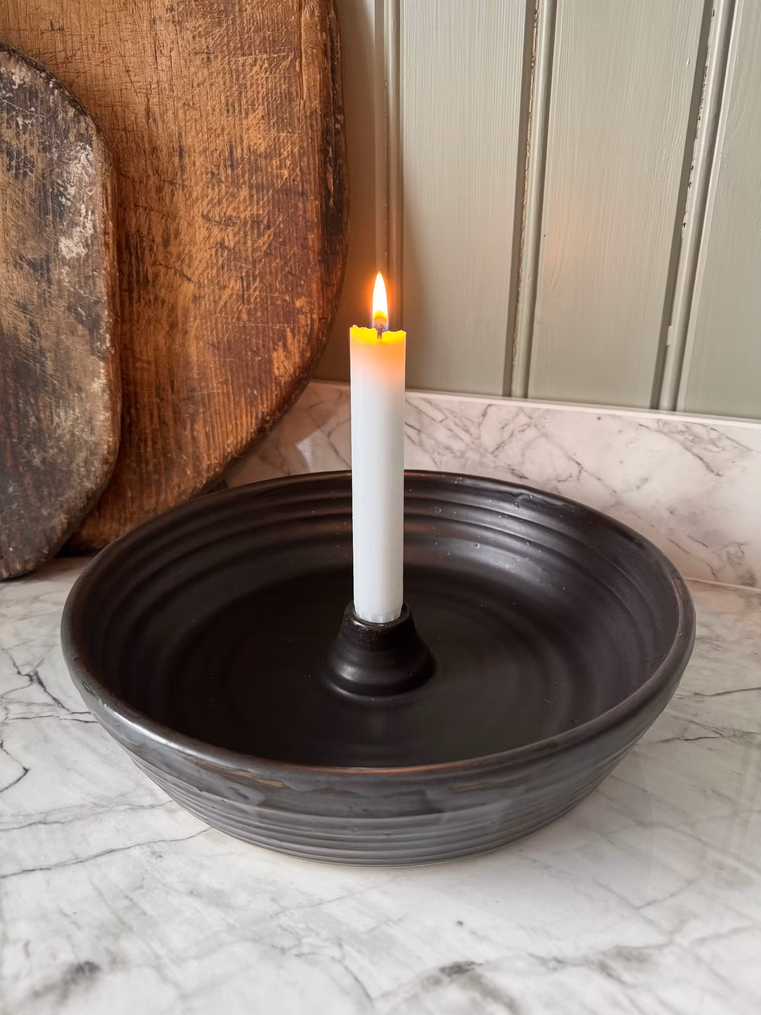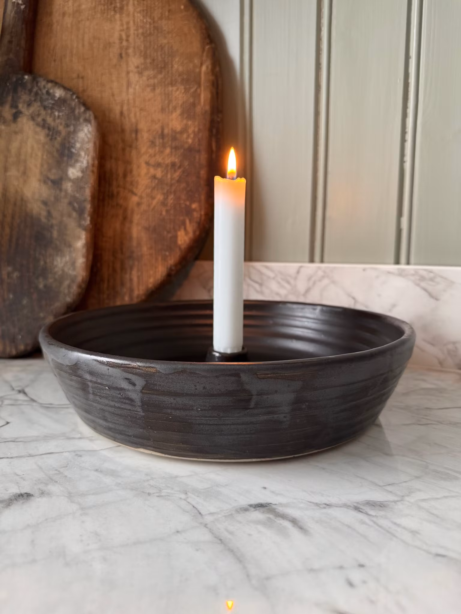 Ett stort matt svart ljusfat där det finns gott om utrymme att dekorera efter säsong. Fyll fatet med det du önskar eller låt det vara som det är. Drejad i återvunnen stengodslera. Tål diskmaskin ifall stearinstänk uppstår.