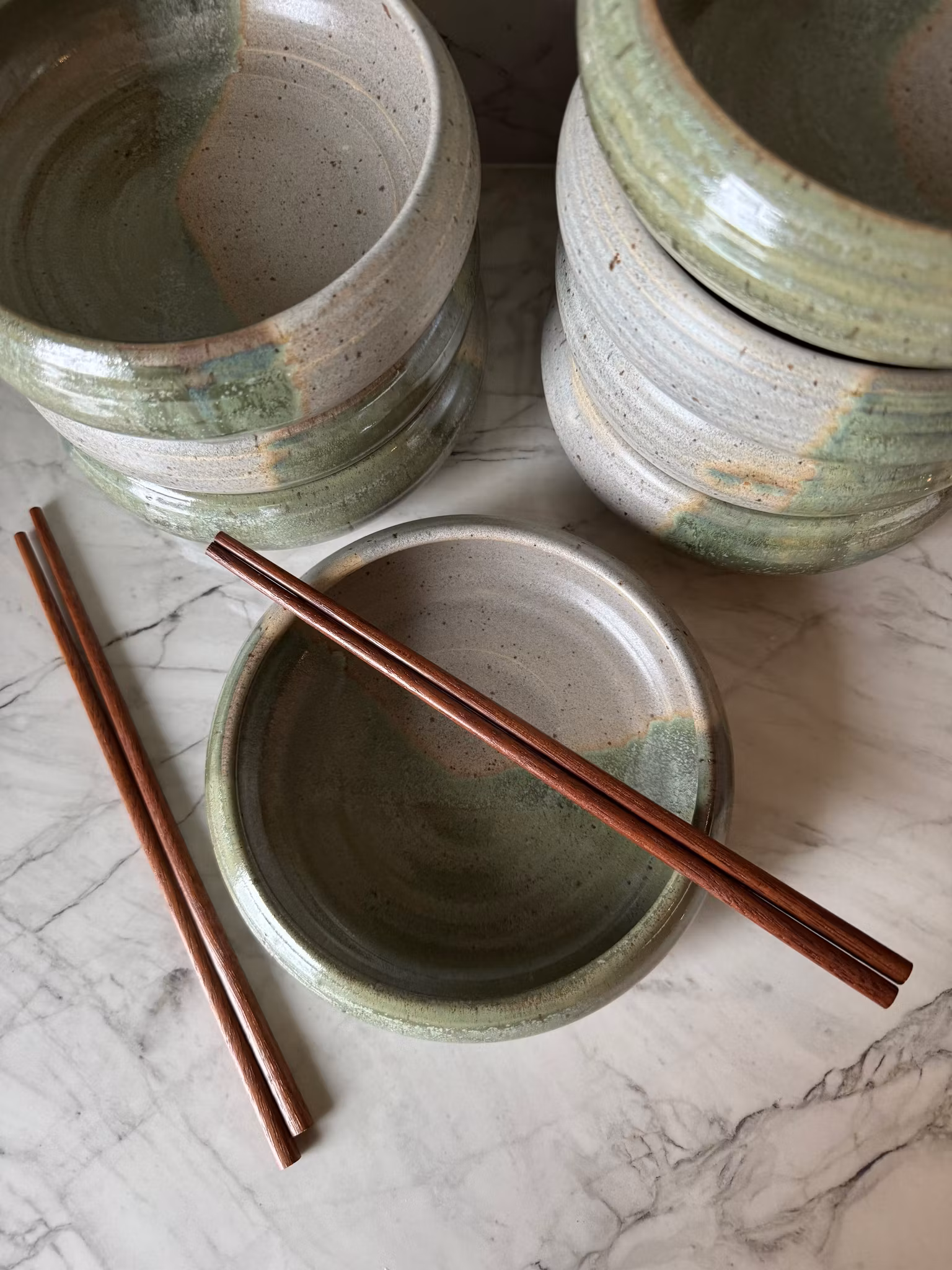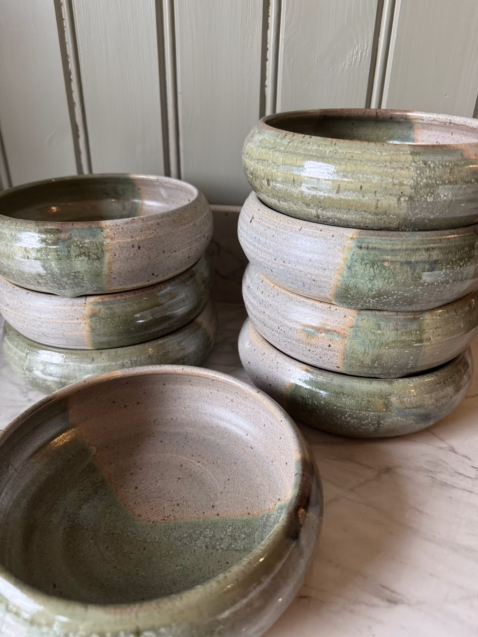 Matskål med dubbelglasering. En populär form som passar såväl till asiatiska bowls som soppor eller snacks. Med fördel äts rätter med sked ur dessa då den insvängda toppen gör det lätt att få med maten på skeden. Drejad i återvunnen stengodslera. Variationer förekommer då batcherna med återvunnen lera kan skilja sig något och därmed påverka resultatet av glaseringen.