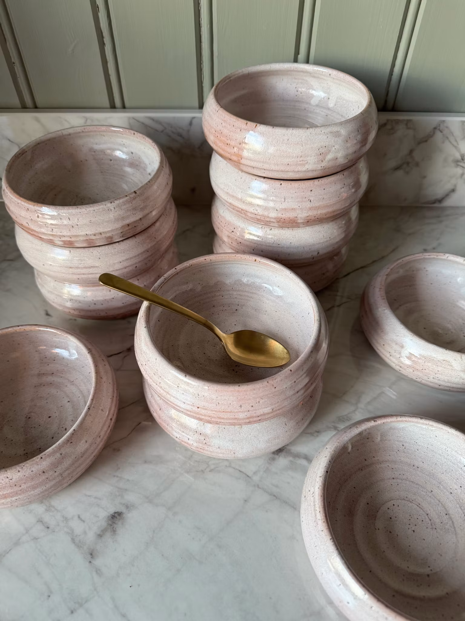 En mindre variant till den populära matskålen. Glaserad i den mjuka och snälla rosa glasyren. Skålarna är lite sådär vilt glaserade och jag har valt att spara rinningarna då jag tycker det blir mer liv i föremålen. Det ser ut som smält glass längs kanten. Skålarna är perfekta till ett mellanmål, snacks eller vad man nu önskar bjuda på. Observera att skålen avser den mellanstora av dem på bilden. Bilden syftar till att visa dom olika storlekarna tillsammans.