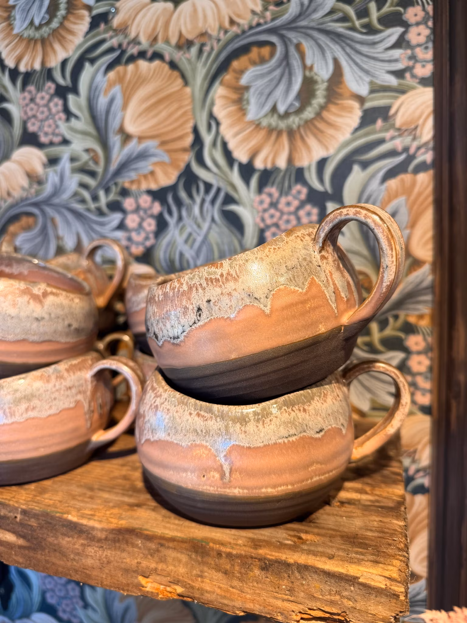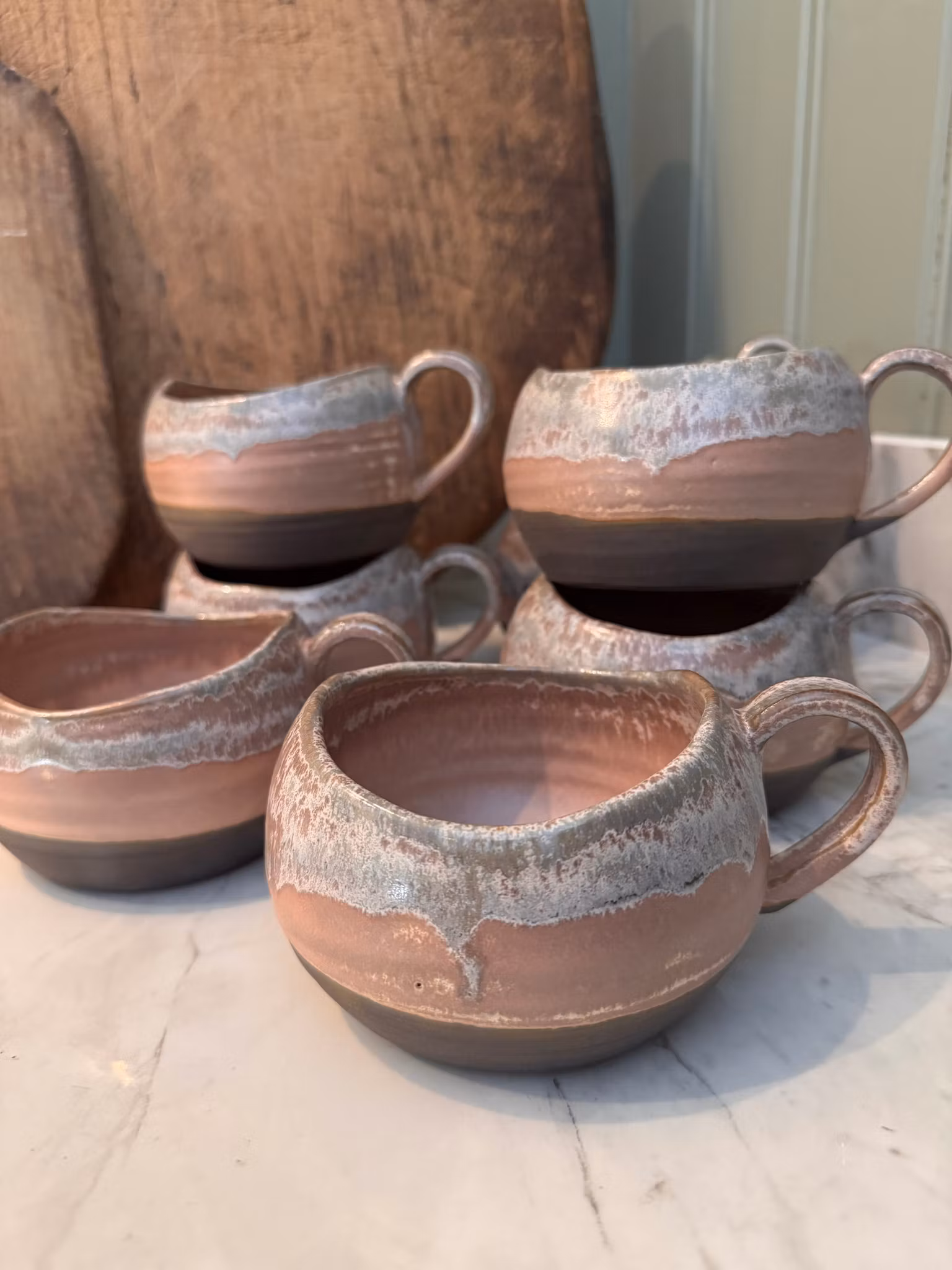 En drejad mugg i svart stengodslera som fått en skimmerrosa glasyr. Rimmen på muggen har skurits med kniv för att skapa ett vackert assymetriskt avslut. Drick en varm choklad med marshmallows ur dessa eller servera en smarrig förrätt eller efterrätt som äts med sked. Kan användas till så mycket mer än bara kaffe och te som kanske är det första man tänker på.