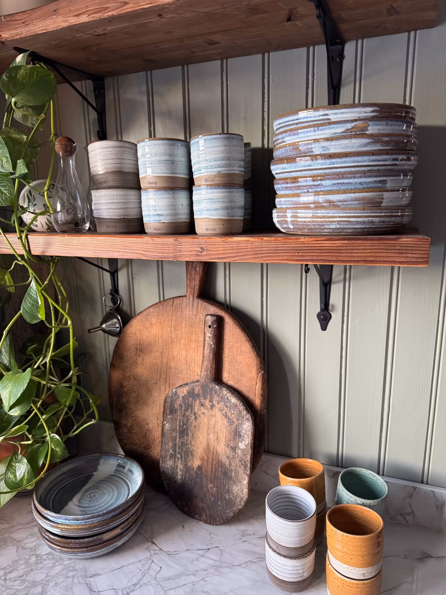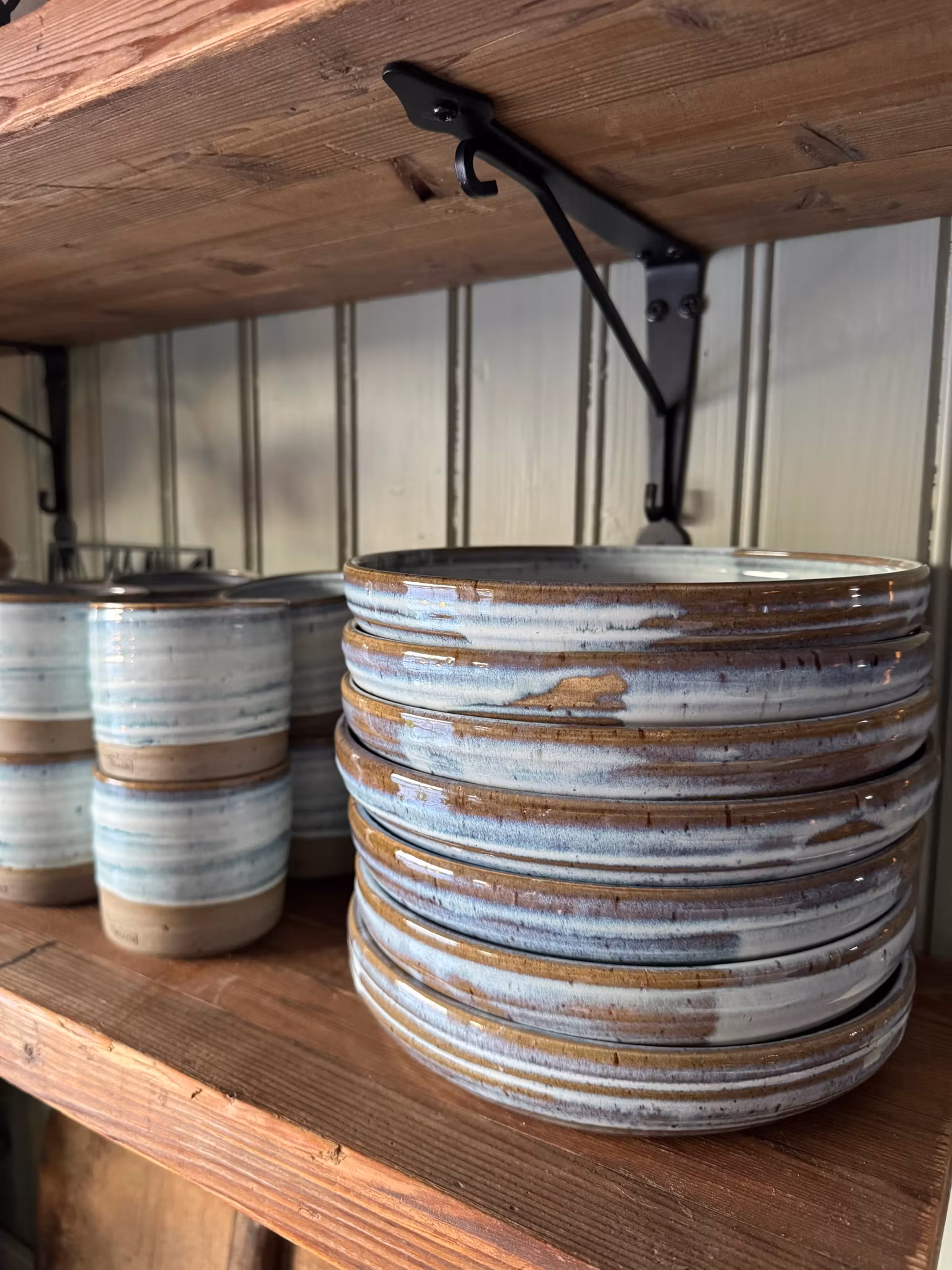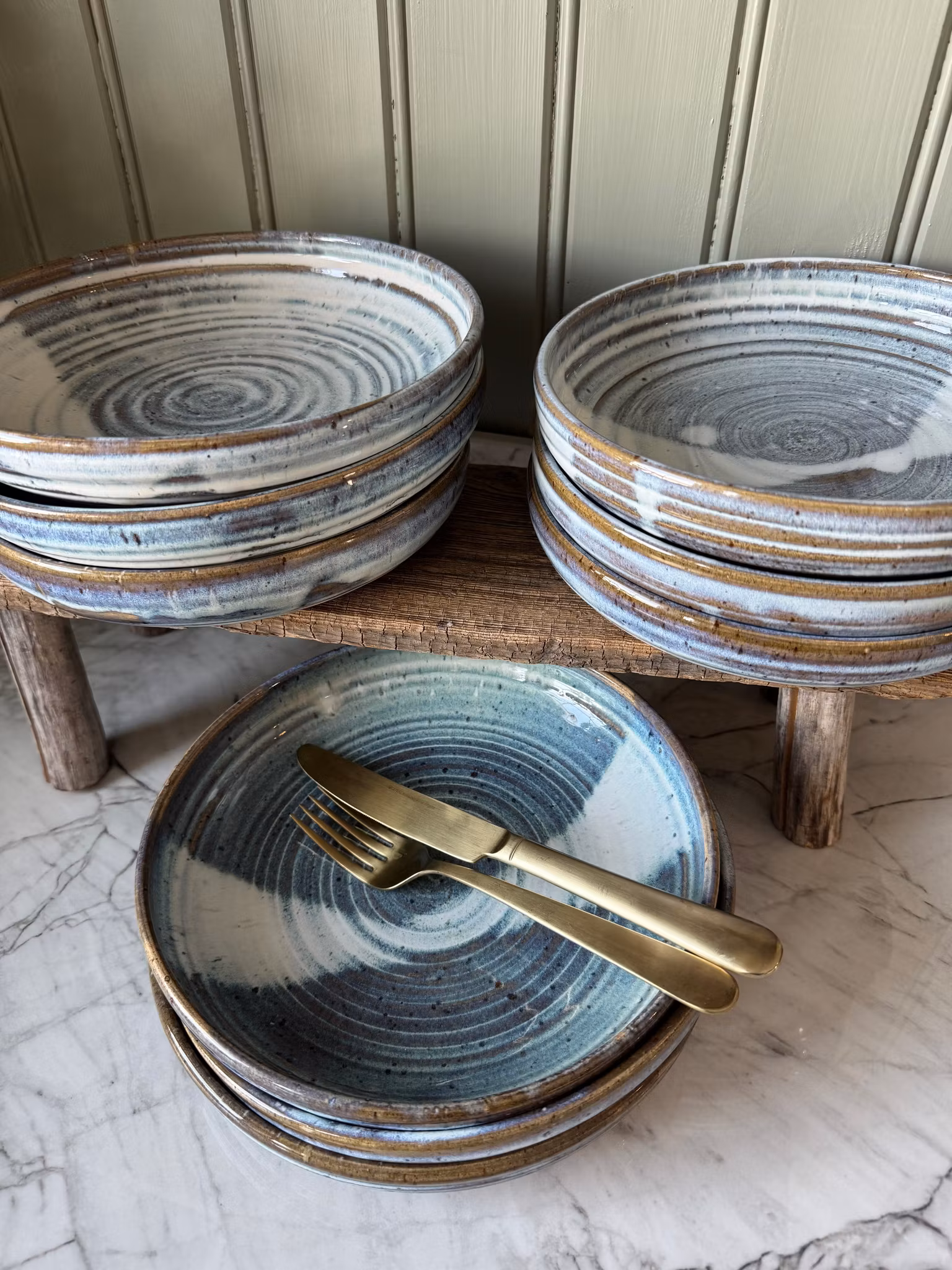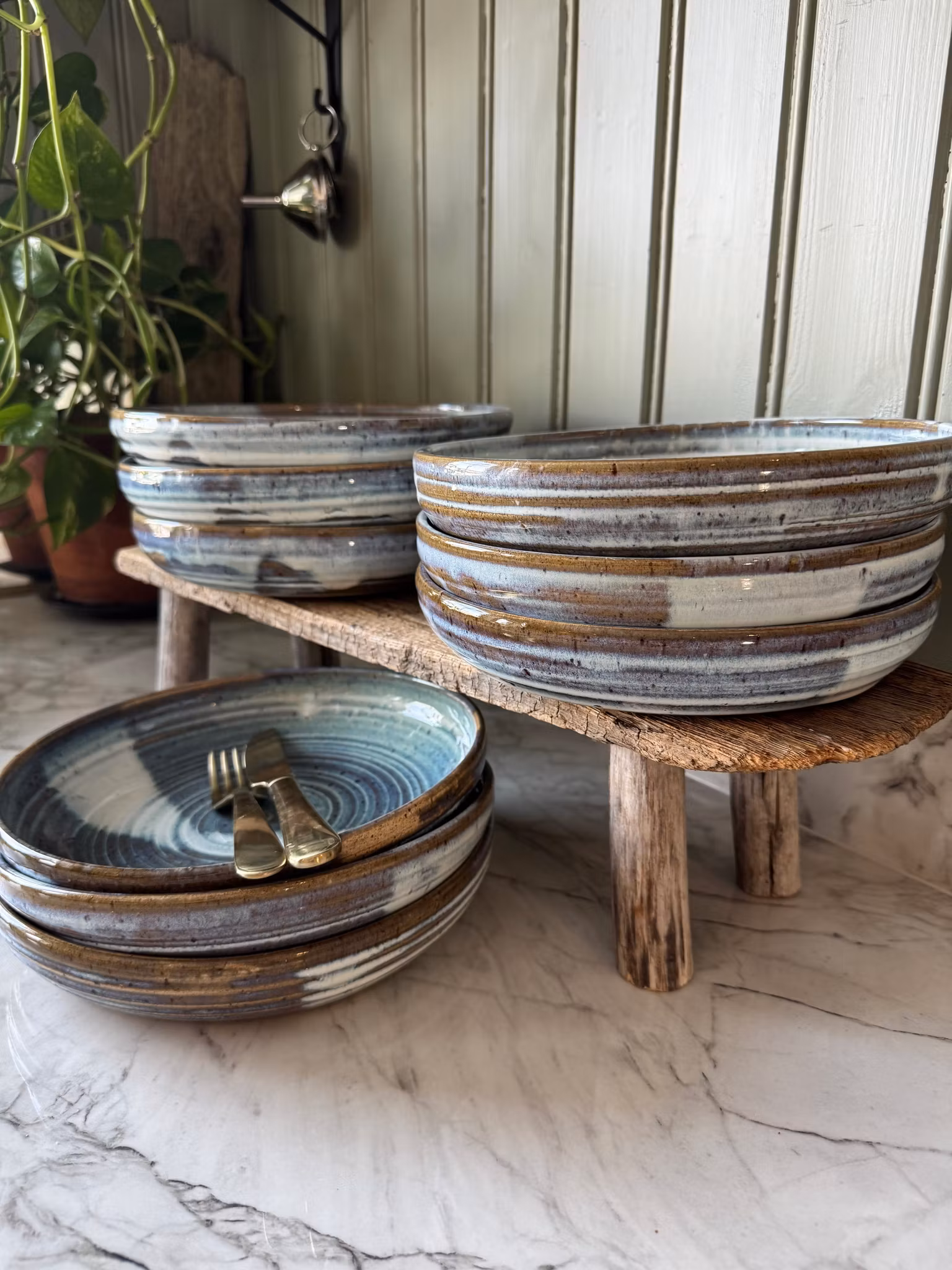 En tallrik med lagom hög kant för att kunna servera pastarätter, goda sallader mm ur. Drejad i återvunnen lera som ger varje tallrik ett unikt utseende. Mått ca 23 cm vid och 4.5 cm hög. Tallrikarna tål diskmaskin, mikro och även att förvärmas i ugn för att kunna servera maten varm.